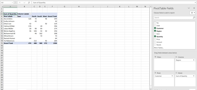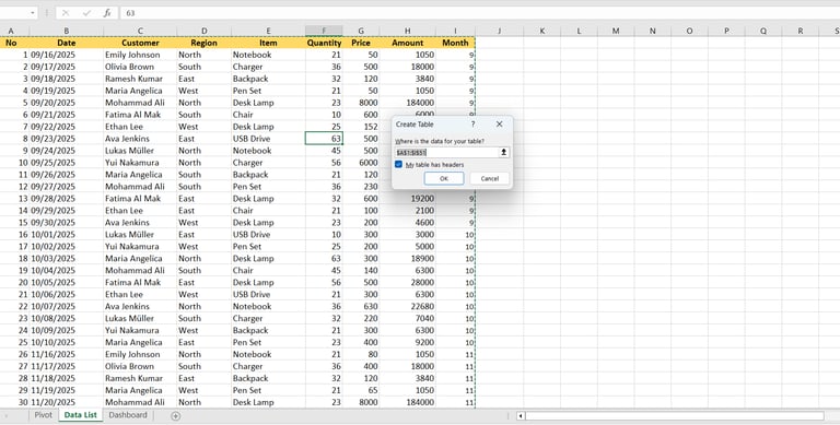 Why does this matter? An Excel Table automatically expands when you add new rows. Your Pivot Table and charts will pick up the new data automatically — no manual range updates needed.