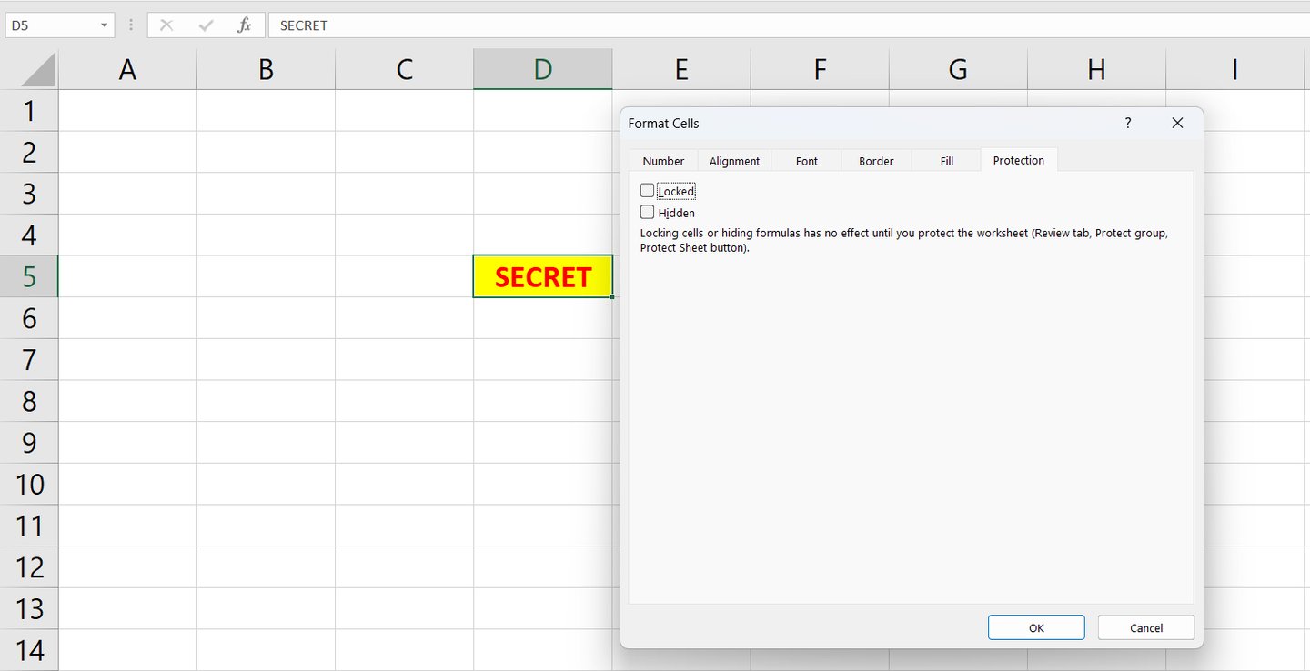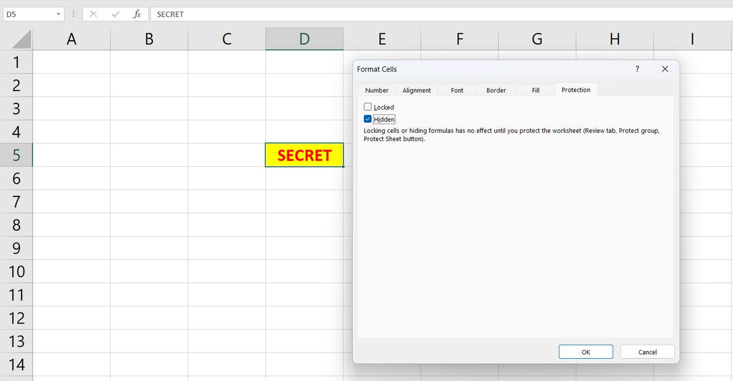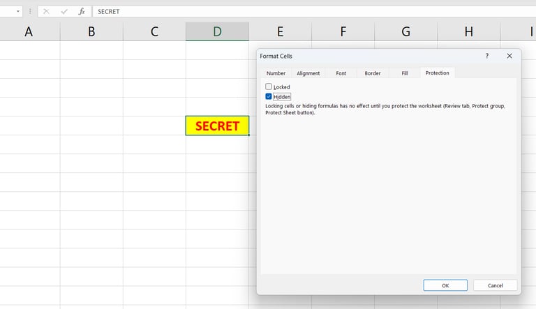 Check the box that says "Hidden." Note: This doesn't make the cell disappear; it only hides the text in the formula bar once the sheet is protected.